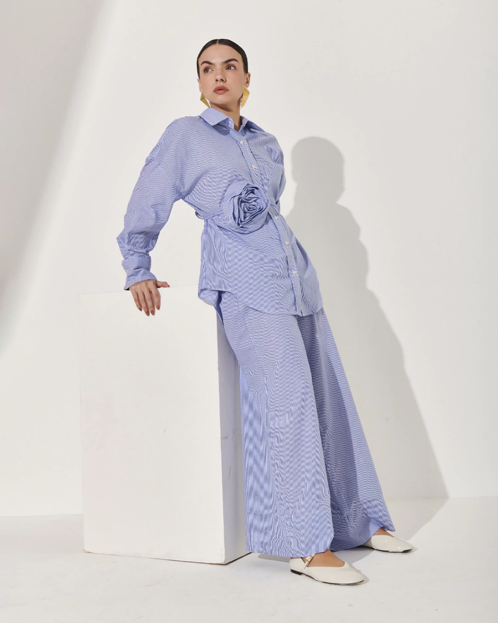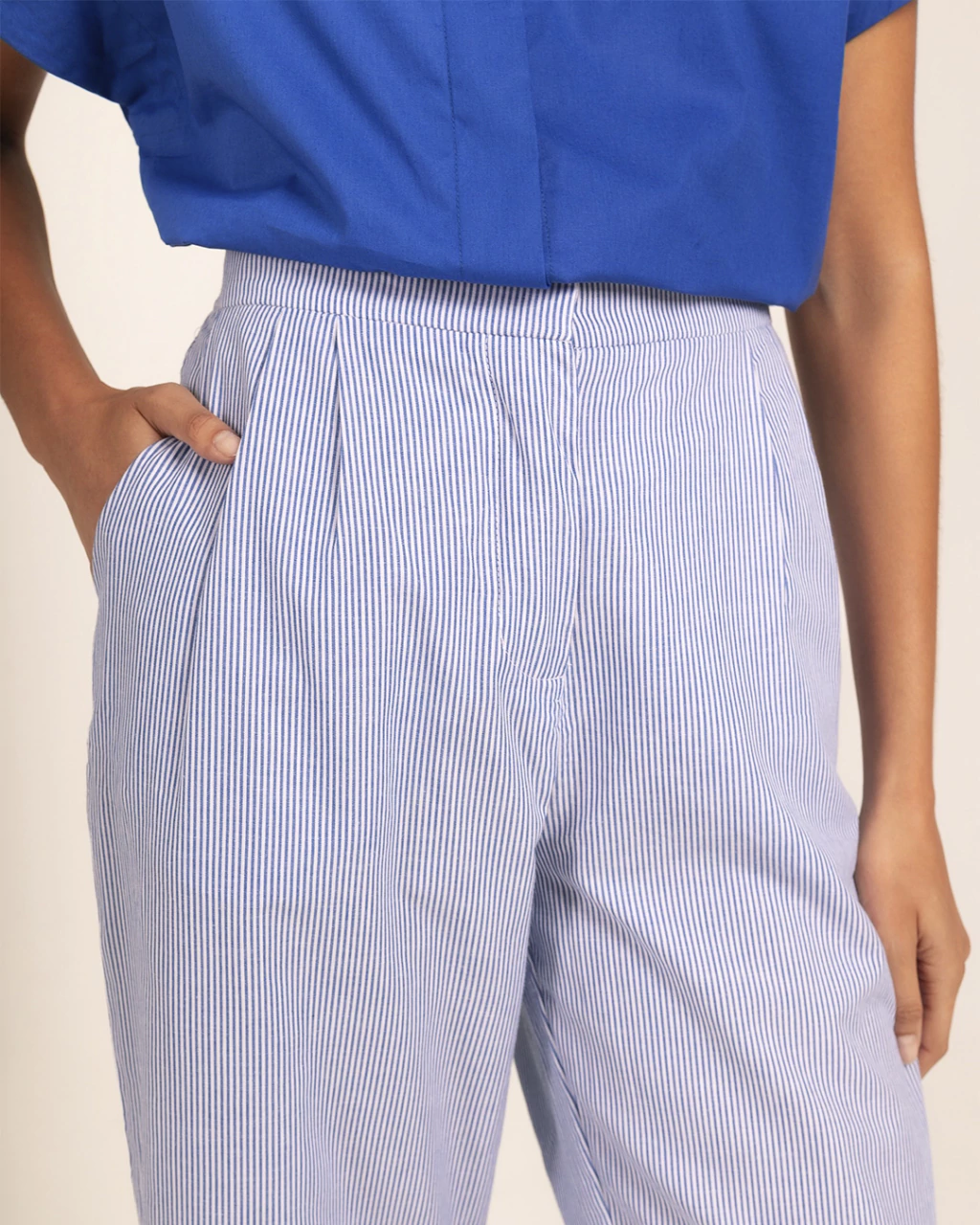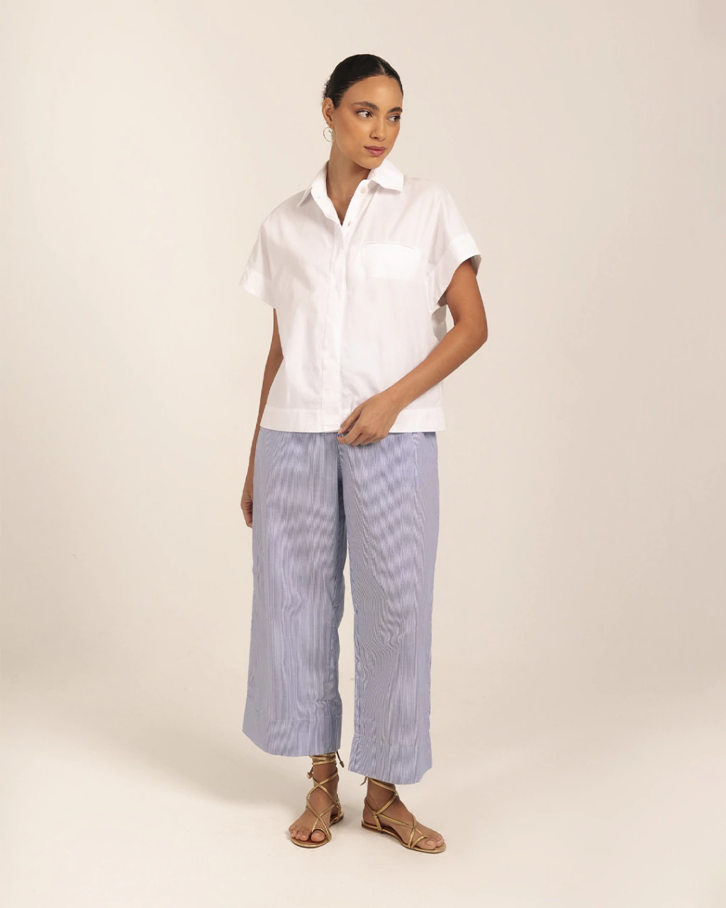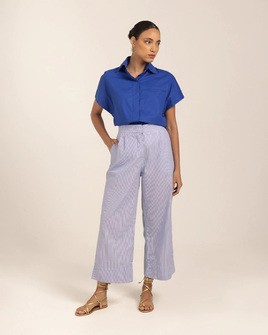 Calça de alfaiataria com bolso faca e perna levemente flare comprida. Fechamento frontal com zípers e colchetes.