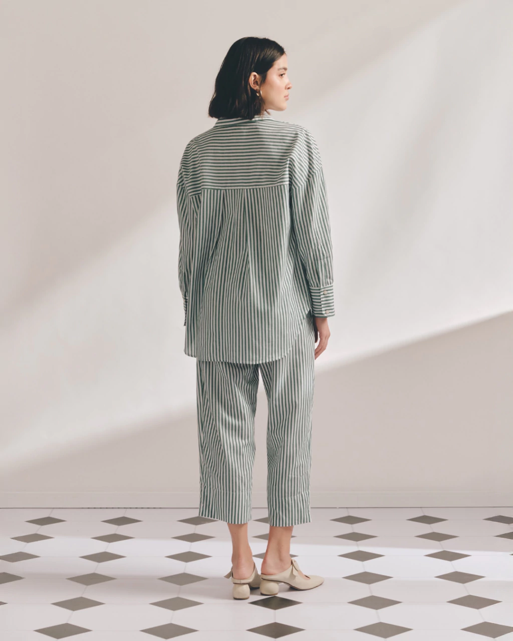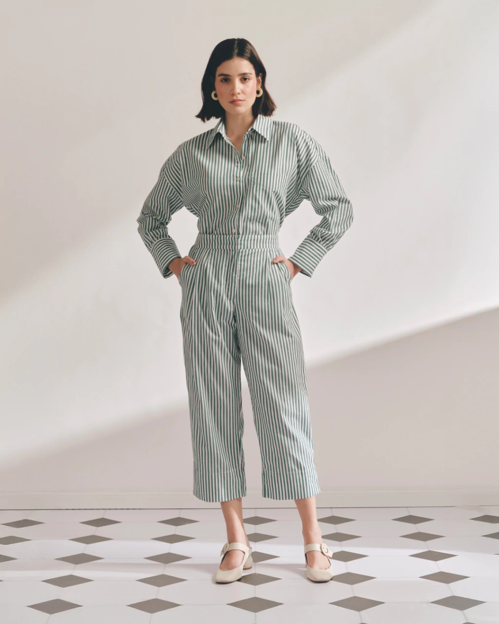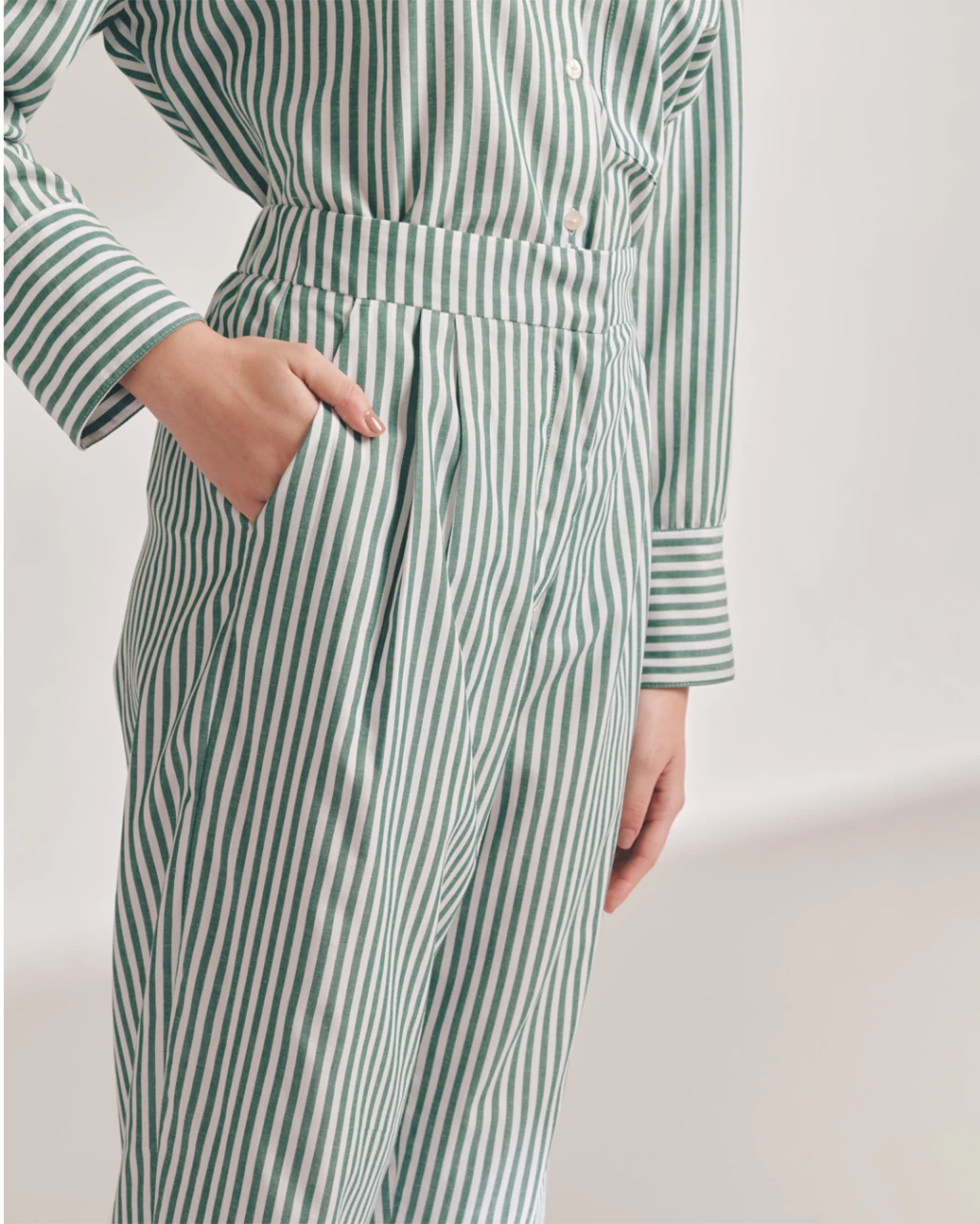 Calça Alfaiataria tricoline, bolsos faca laterais, elástico no cós. Comprimento midi.
