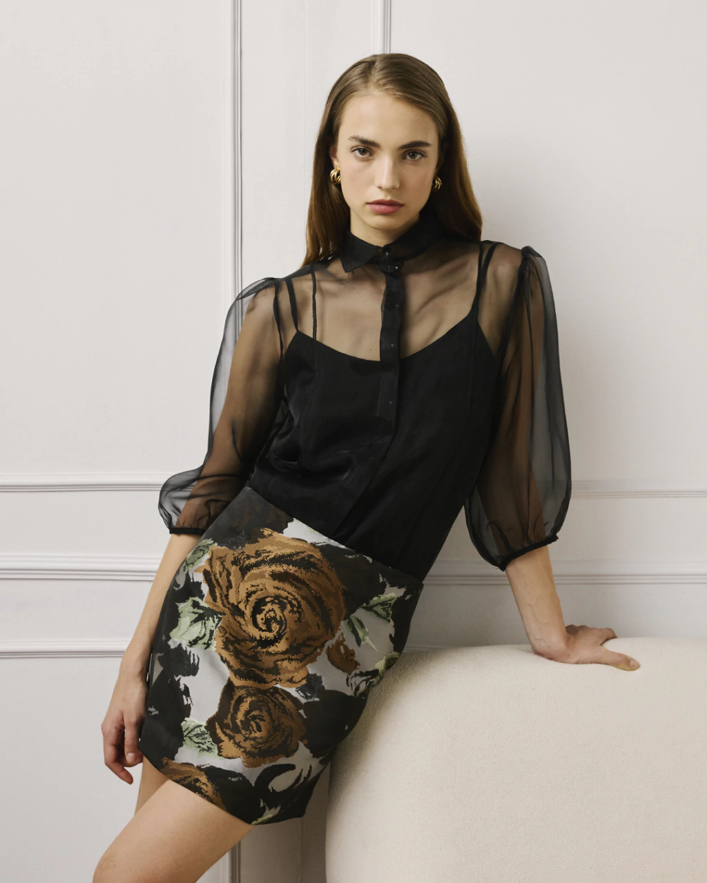 Mini saia jacquard, cintura mediana, fechamento por ziper invisivel lateral. Forrada.