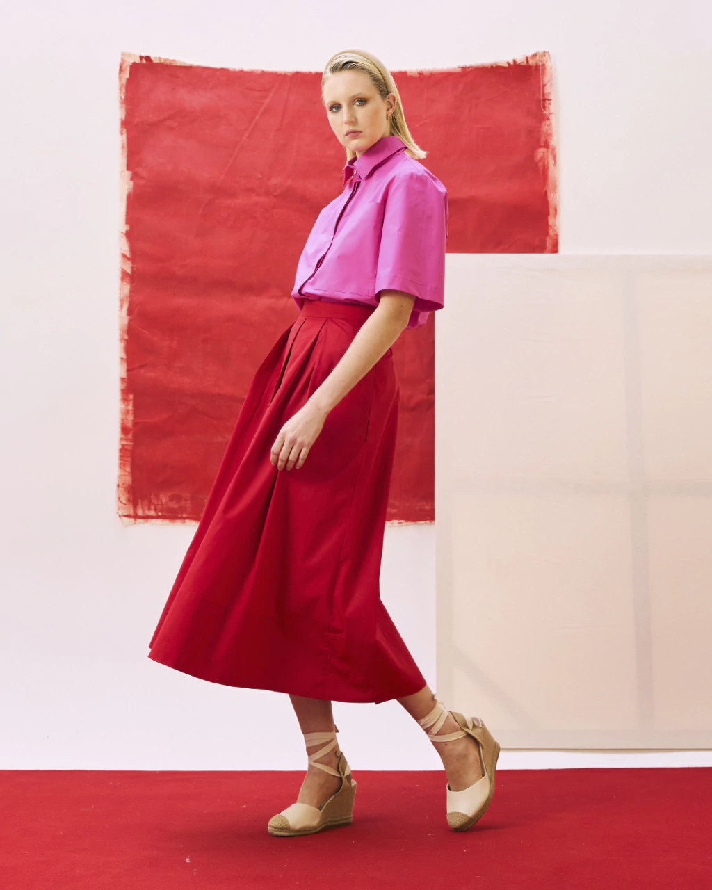 Saia godê de comprimento midi com pregas, bolsos laterais e fechamento por ziper invisival.