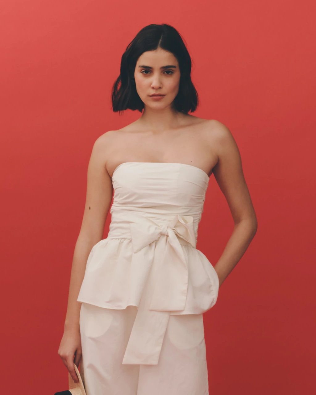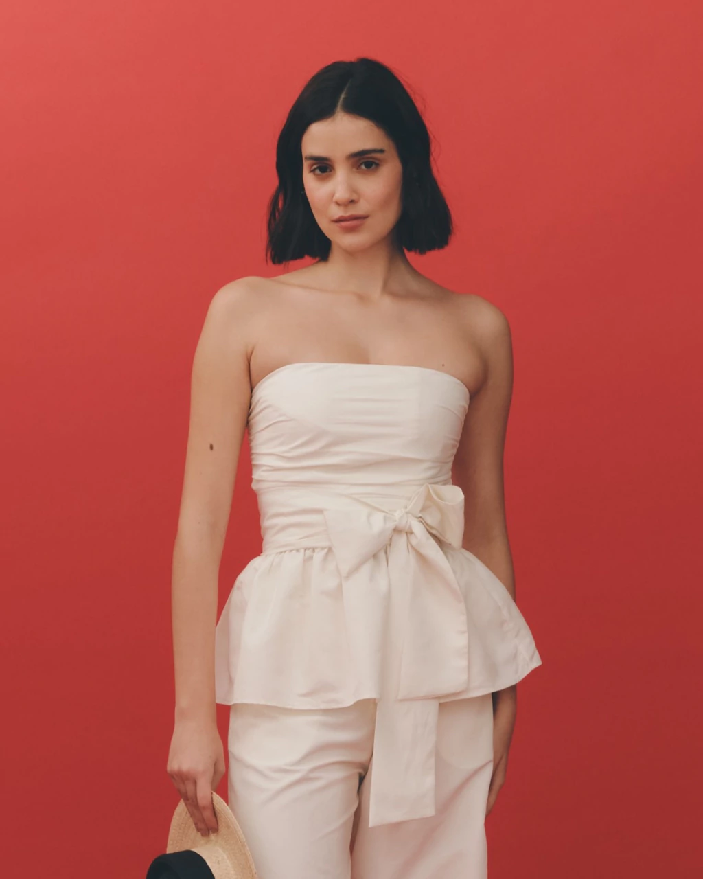 Top drapeado modelo tomara que caia. Forrado. Possui duas faixas laterais que permitem amarração frontal.