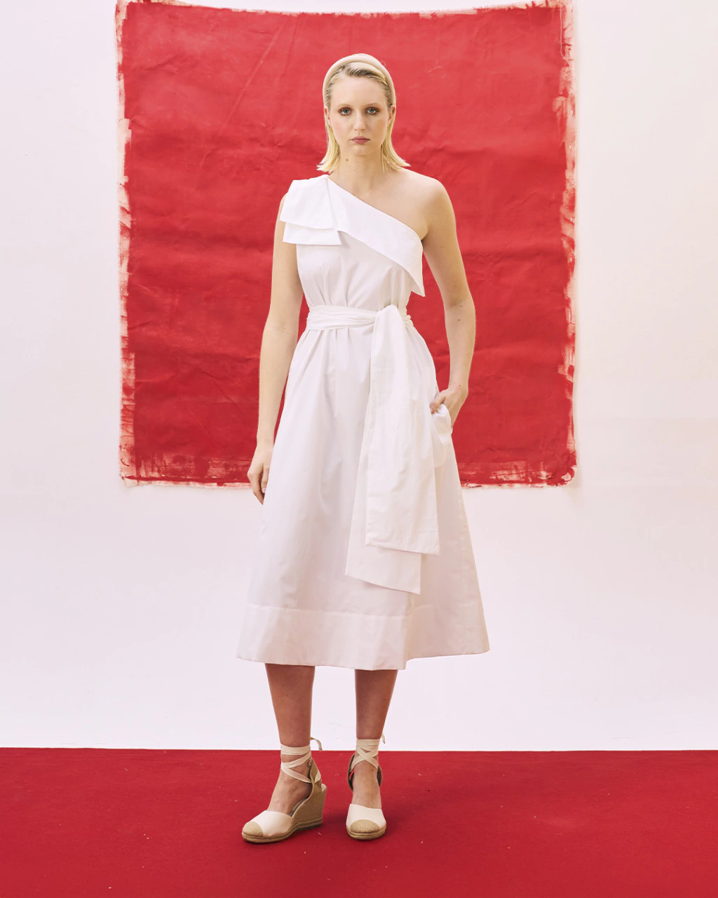 Vestido modelo um ombro só com laço, comprimento midi, bolsos laterais.