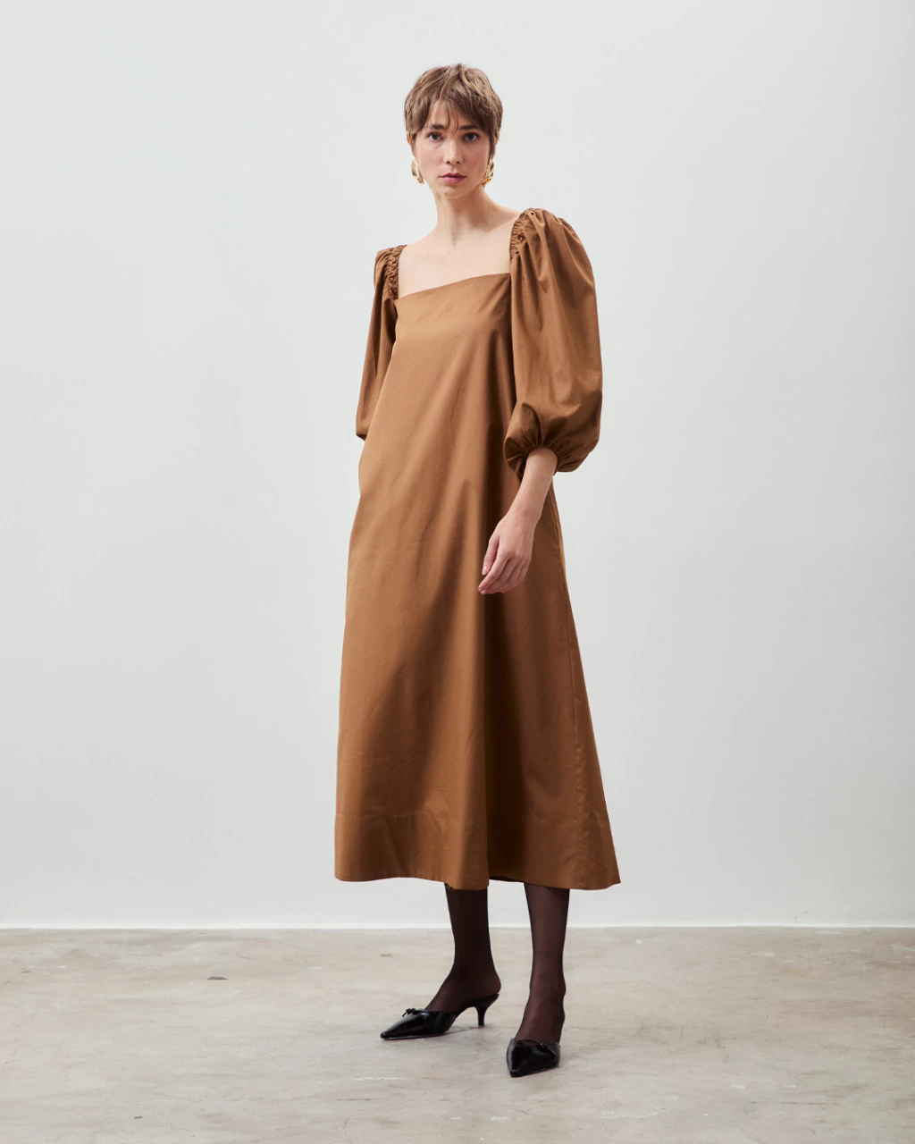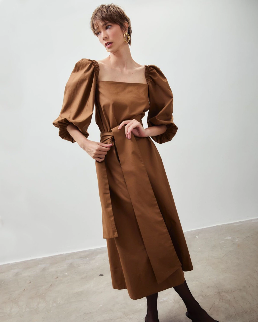 Vestido com mangas bufantes. Decote Reto. Bolsos lateriais. Comprimento Midi.