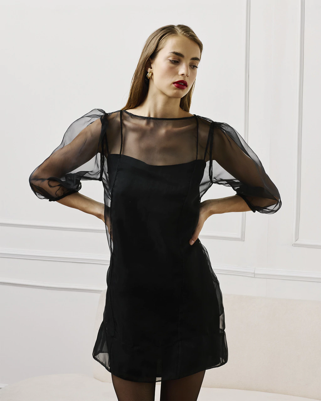 Vestido Organza com mangas levemente bufantes, recortes frontais como detalhe, bolsos laterais, fechamendo por um botão nas costas. Possui vestido underware
